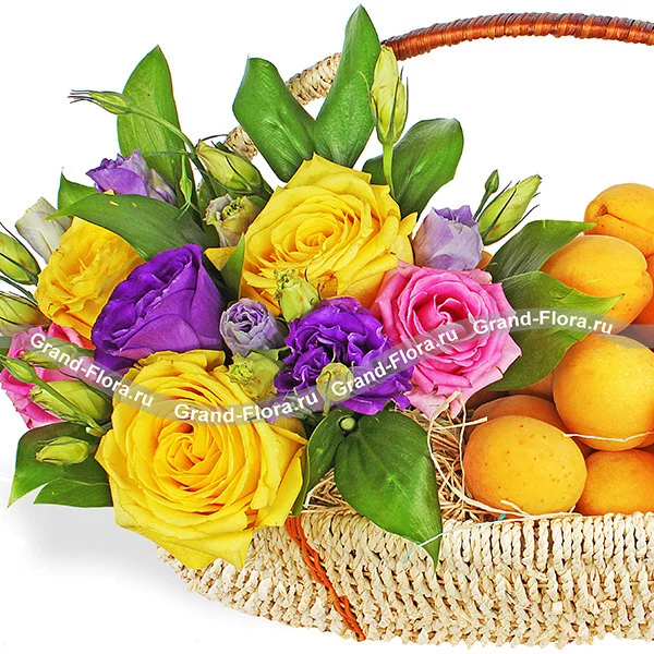 Стандартный: роза желтая - 3 шт., роза розовая - 2 шт., эустома фиолетовая - 1 шт., рускус - 2 шт., оазис, корзина средняя, абрикосы - 1,5 кг.