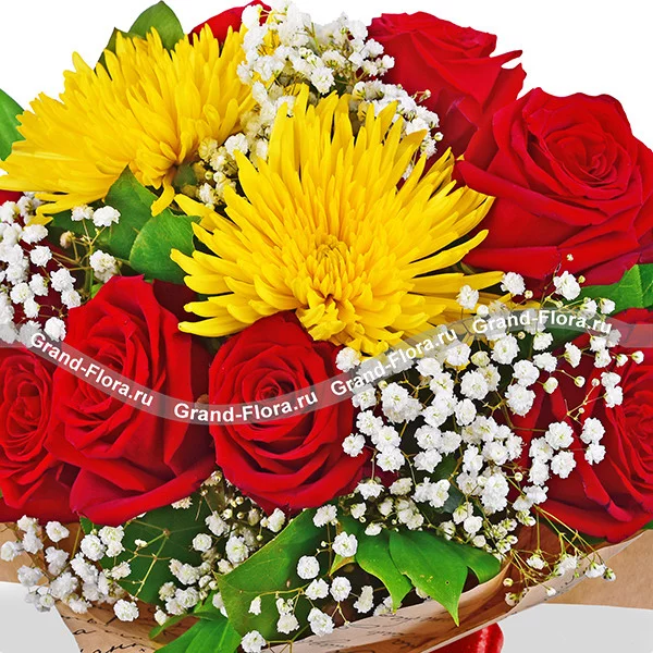 Уменьшенный: роза красная (50 см) - 5 шт., хризантема одноголовая (желтая) - 2 шт., гипсофила - 1 шт., крафт, лента.