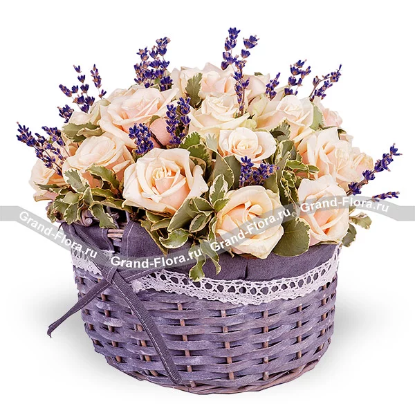 Стандарт (на фото): роза кремовая - 21 шт., статица/или гипсофила, декоративная зелень, оазис, корзина.
