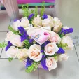 Стандартный (на фото): роза кремовая - 21 шт., статица, декоративная зелень, оазис, корзина.